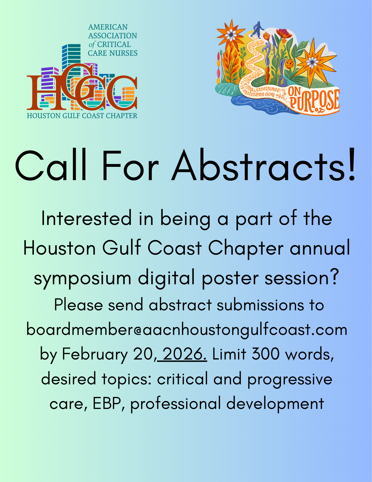 The AACN Houston Gulf Coast Chapter is now accepting abstracts for our virtual poster session that will accompany our annual symposium on April 24, 2026. If you have a current poster, or have recently completed a research, EBP, or QI project, please consider submitting an abstract.